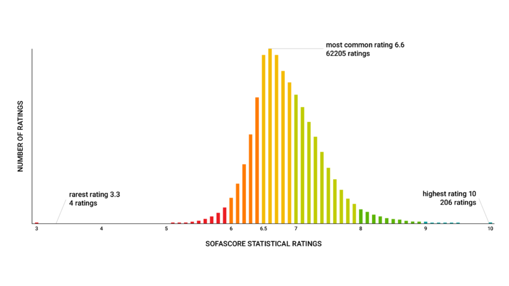 La media del rating de SofaScore se ubica en torno a los 6.86 puntos y la moda es de 6.6, lo cual desde el vamos implica una lectura diferente a los puntajes que ponen los periodistas en las crónicas publicadas por los diarios, donde 6 suele ser una una nota muy buena y el 7 ya es propiedad de un jugador destacado.